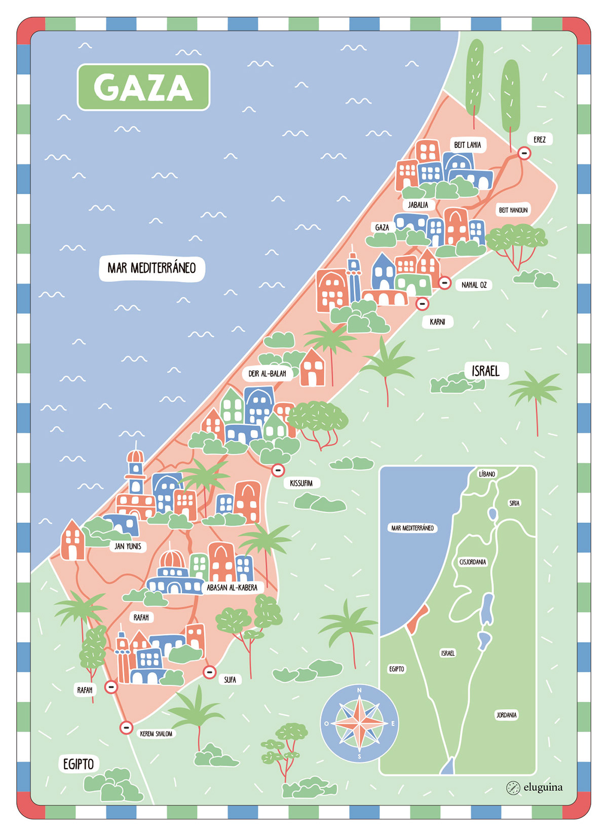 “Um mapa para Gaza” é um projeto colaborativo que envolve ilustradores de mapas de todo o mundo. Consiste na criação de uma coleção de mapas da Faixa de Gaza como demonstração de apoio e como homenagem ao território que está a ser destruído e às pessoas que o habitam.