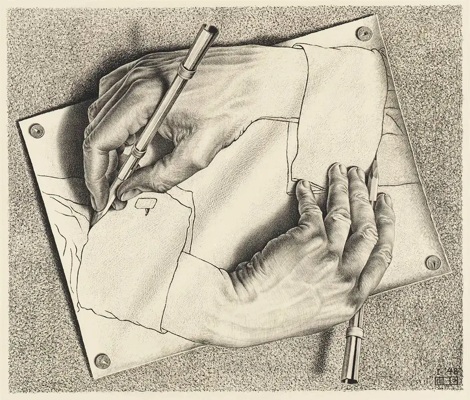 A gravura Mãos a Desenhar, de 1948, na qual uma mão desenha uma mão, que desenha a mão, revela um dos problemas-base da modernidade. William Everdell considera que o começo do século XX foi marcado pelo paradoxo do matemático, lógico e filósofo Bertrand Russell (1872-1970) do barbeiro que se barbeia a si próprio. Perguntava Russell: «quem barbeia um barbeiro que barbeia toda a gente que não se barbeia a si própria?» Qualquer que seja a resposta, entra em contradição com o enunciado da pergunta. Com base neste simples paradoxo, Russell destruiu os esforços de Gottlob Frege (1848-1925) e de gerações de matemáticos para construir uma lógica perfeita e autorreferenciada. Foi a partir de paradoxos semelhantes que Kurt Côdel (1906-1978) mostrou que os esforços de gerações de matemáticos do dobrar do século, nomeadamente David Hilbert (1862-1943), para basear a matemática numa lógica perfeita e completa estavam destinados ao fracasso. A mão que desenha uma mão que a desenha não pode ser uma mão verdadeira.