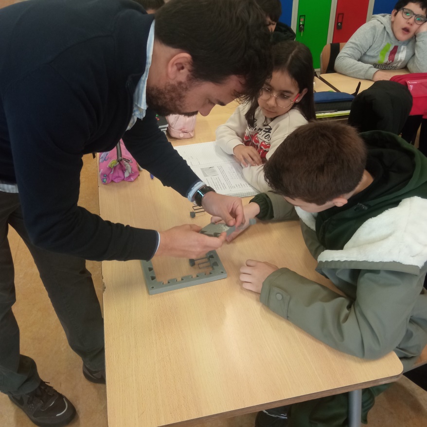 Filipe Alves trouxe um microscópio e outros materiais para os alunos explorarem durante a sessão, e explicou como são feitos os chips, pequenos componentes usados em muitos aparelhos do dia a dia, como telemóveis e computadores. Os alunos descobriram algo muito curioso: os chips são feitos a partir de uma espécie de “bolacha”, chamada wafer, que se faz a partir da areia.